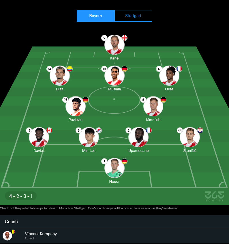 บาเยิร์นยังอยู่ในสภาพทีมที่ดูเหนือกว่า แม้อาจมีการโรเตชั่นบางจุดหลังผ่านเกมยุโรปมา แต่ตัวจริงที่คาดก็ยังแน่นทุกตำแหน่ง โดยเฉพาะแนวรุกที่มีทั้ง เคน, มูเซียล่า, โอลิเซ่ และดิอาซ ซึ่งพร้อมปั่นป่วนแนวรับทีมเยือนได้ตลอด