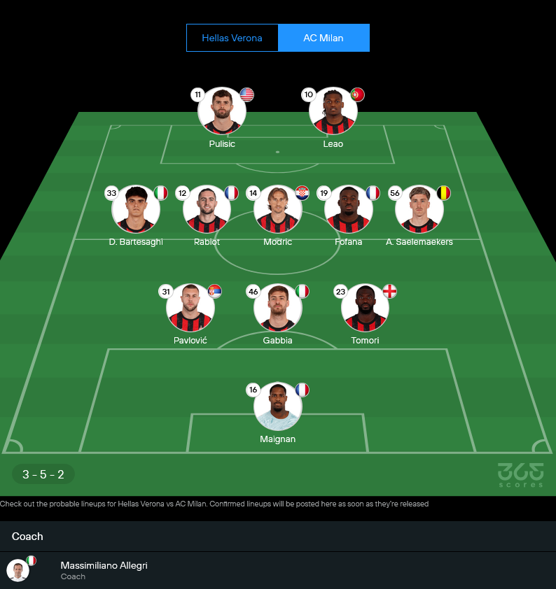 ฝั่ง มัสซิมิเลียโน อัลเลกรี น่าจะกลับมาใช้ 3-5-2 ตามถนัด หลังลองหลัง 4 แล้วภาพไม่ดีนัก จุดที่ยังต้องลุ้นคือแนวรุก เพราะ พูลิซิช กำลังฝืด ส่วน เลเอา ก็ยังไม่มีสถิติยิงที่สนามแห่งนี้ แต่ข้อดีคือแดนกลางยังมีตัวคุมเกมครบ โดยเฉพาะ โมดริช, ราบิโอต์ และ โฟฟาน่า ที่ช่วยให้เกมเดินได้ลื่นกว่าเดิมพอสมควร