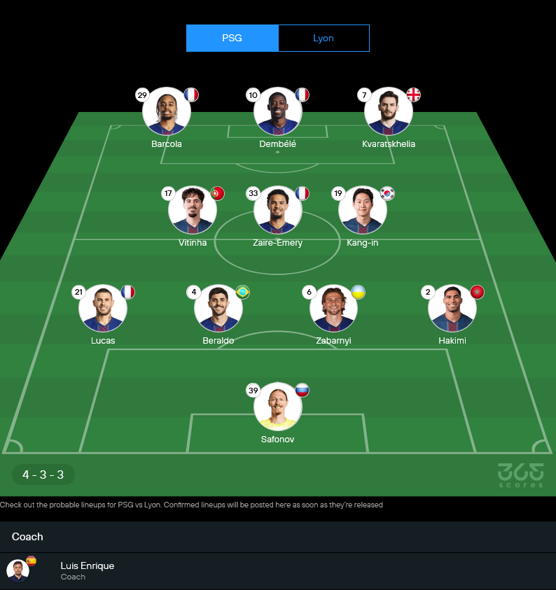 เปแอสเชของ หลุยส์ เอ็นริเก้ ยังน่าจะยึดระบบ 4-3-3 เหมือนเดิม แม้มีปัญหาตัวเจ็บอย่าง เดซิเร่ ดูเอ้, ฟาเบียน รุยซ์ และ นูโน่ เมนเดส แต่จากขุมกำลังที่มีอยู่ก็ยังถือว่าแน่นพอจะรักษามาตรฐานได้ เกมรุกคาดว่าจะนำโดย บาร์โคลา, เด็มเบเล่ และ ควารัตสเคเลีย ซึ่งเป็นชุดที่ทั้งเร็ว พลิกเกมได้ และจบสกอร์คม