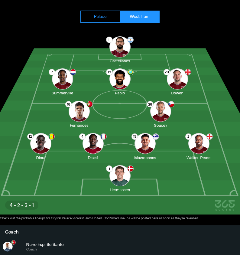 ฝั่งเวสต์แฮมสภาพทีมดูนิ่งกว่า ตัวเจ็บหลักมีแค่ ลูคัสซ์ ฟาเบียนสกี้ ส่วนแกนหลักรายอื่นพร้อมลงค่อนข้างครบ และจากทรงผู้เล่นที่มี น่าจะมาในระบบ 4-2-3-1 ใช้ ปาโบล เชื่อมเกมหลัง กาสเตญานอส โดยมี โบเว่น กับ ซัมเมอร์วิลล์ คอยป่วนด้านข้าง