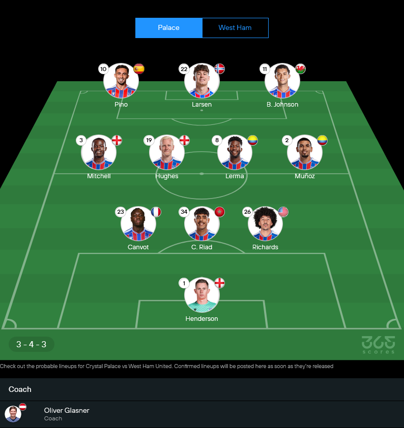 พาเลซยังมีปัญหาตัวเจ็บพอสมควร ทั้ง อดัม วาร์ตัน, ชี๊ค ดูกูเร่, เอ็ดเวิร์ด เอ็นเคเตียห์ และ อีวานน์ เกสซ็องด์ ส่วน มักซ็องซ์ ลาครัวซ์ ยังต้องเช็กความฟิต ทำให้เกมนี้น่าจะยึดระบบ 3-4-3 เหมือนเดิมเพื่อเน้นความคล่องทางริมเส้นและใช้สามแนวรุกเล่นงานแนวรับเวสต์แฮม