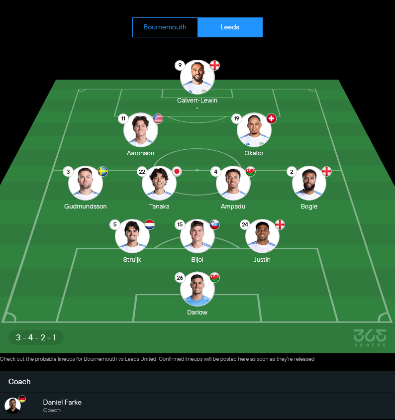 ลีดส์ของ ดาเนี่ยล ฟาร์เก้ ยังขาด อันตอน สตัค แน่นอน ส่วนแดเนี่ยล เจมส์ยังต้องเช็กความฟิต นอกนั้นถือว่าค่อนข้างพร้อม ระบบ 3-4-2-1 ของพวกเขาจุดเด่นอยู่ที่ความยืดหยุ่น เวลาเกมรับก็ยืนกันแน่น แต่พอได้บอลเมื่อไร ตัวรุกสองคนด้านหลังหน้าเป้าจะพุ่งเข้าพื้นที่ทันที