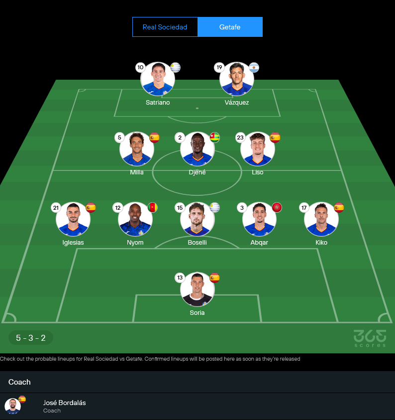 เกตาเฟ่ยังมาในระบบ 5-3-2 หรือขยับเป็น 3-5-2 ตามจังหวะเกม จุดแข็งคือเกมรับเป็นแพ็ก วิ่งไล่มีระบบ และเล่นตามสไตล์ของบอร์ดาลาสแบบชัดเจน ส่วนตัวที่หายไปมี ซาอิด โรเมโร่ กับ โดมิงกอส ดูอาร์เต้ ติดโทษแบน และ ฆวนมี่ ยังเจ็บ แต่โครงหลักยังอยู่ครบหลายจุด