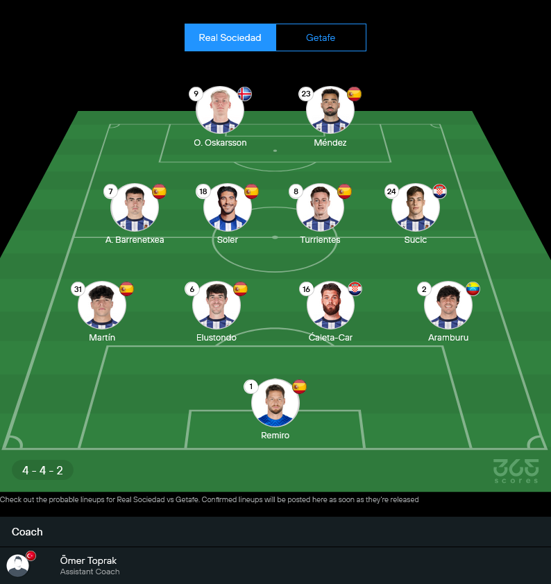 11 ตัวจริงคาดการณ์ เรอัล โซเซียดาด 4-4-2