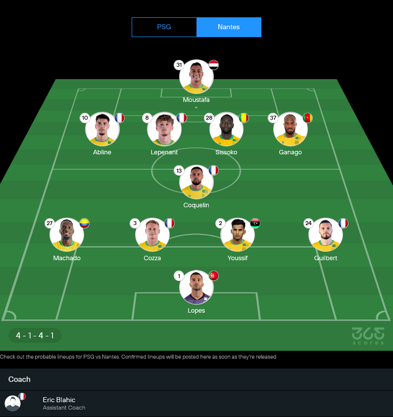 น็องต์น่าจะมาในระบบ 4-1-4-1 เน้นรับแน่นแล้วรอสวนกลับ โดยมีโกเกอแล็งคอยตัดเกมหน้าแผงหลัง ส่วนแนวรุกต้องฝากความหวังไว้กับมุสตาฟา โมฮาเหม็ดและตัวริมเส้นที่จะต้องวิ่งสู้ฟัดกันเต็มที่