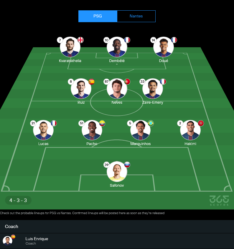 เปแอสเชน่าจะยึดระบบ 4-3-3 ตามถนัด เกมนี้ยังมีตัวที่ต้องเช็กอย่าง นูโน เมนเดส, แก็งแต็ง เอ็นฌองตู และวิตินญ่า แต่โครงหลักยังดูแข็งแรง โดยเฉพาะแนวรุกที่มีทั้ง เดมเบเล่, ควารัตสเคเลีย และดูเอ้ พร้อมป่วนเกมรับทีมเยือน