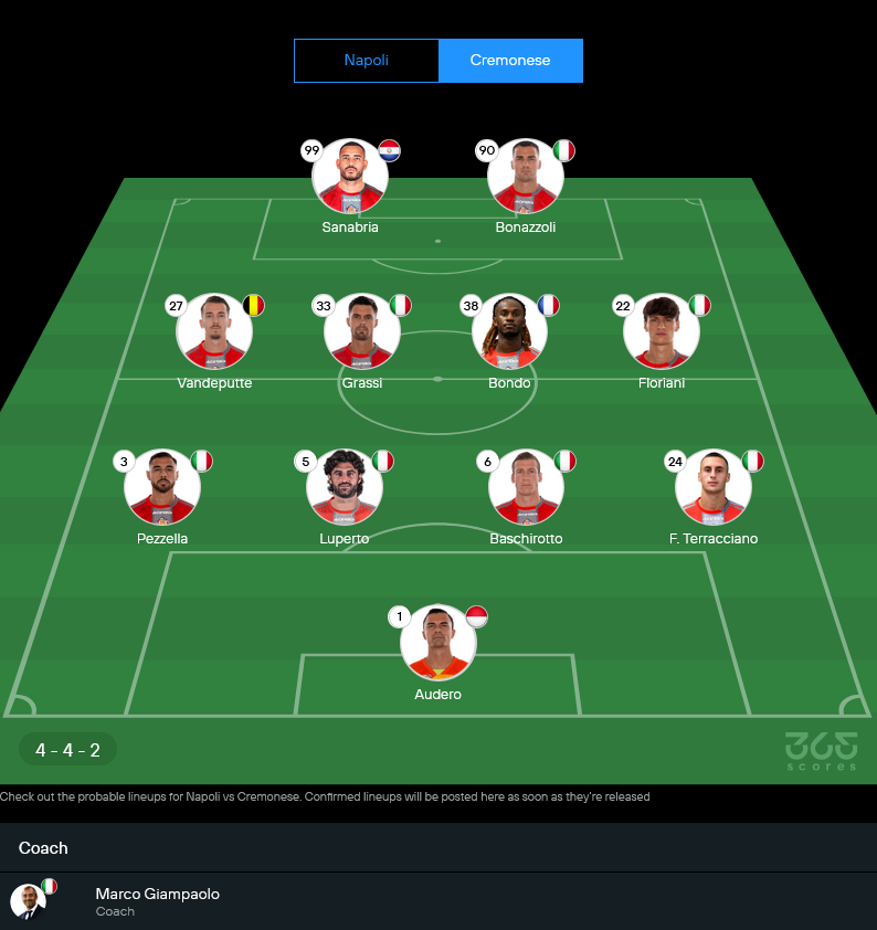 คาดว่าทีมเยือนจะมาในระบบ 4-4-2 แบบเน้นวินัยเป็นหลัก แพ็กกลางให้แน่น แล้วรออาศัยจังหวะสวนจาก ซานาเบรีย กับ โบนาซโซลี่ ถามว่าจะมาเปิดเกมแลกไหม คงไม่ใช่แน่ เพราะถ้าเล่นตามใจนาโปลี มีสิทธิ์โดนลงโทษได้เร็ว