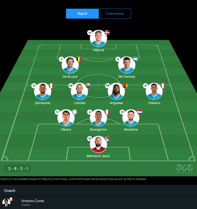 นาโปลีของ อันโตนิโอ คอนเต้ ยังมีปัญหาตัวเจ็บและตัวไม่สมบูรณ์อยู่หลายราย ไม่ว่าจะเป็น โรเมลู ลูกากู, ดาวิด เนเรส, โจวานนี ดิ ลอเรนโซ่ และ อันโตนิโอ แวร์การา ทำให้การเข้าทำอาจไม่หลากหลายเต็มที่ แต่ตัวแกนหลักอย่าง เดอ บรอยน์, แม็คโทมิเนย์, อองกิสซ่า และโลบ็อตก้า ยังพร้อมประคองเกม