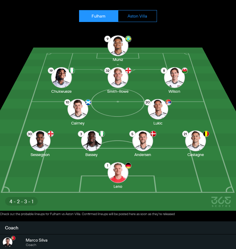 ฟูแล่มของ มาร์โก้ ซิลวา ยังมีปัญหาตัวเจ็บ เควิน เจ็บเท้าแน่นอน ส่วน อเล็กซ์ อิโวบี้ และ เคนนี่ เตเต้ ยังต้องเช็กความฟิต คาดว่าจะใช้ระบบ 4-2-3-1 เหมือนเดิม โดยมี โรดริโก้ มูนิซ ยืนหน้าเป้า และ เอมิล สมิธ โรว์ คอยปั้นเกมด้านหลัง ในมุม วิเคราะห์บอล เจ้าบ้านต้องเน้นแดนกลางเป็นพิเศษ ห้ามปล่อยให้วิลล่าตั้งเกมง่าย
