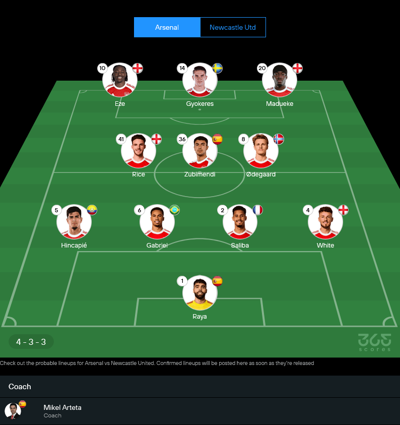 มิเกล อาร์เตต้ายังเจอปัญหาตัวเจ็บ โดยบูกาโย่ ซาก้าเจ็บกล้ามเนื้อ ส่วนเยอร์เรียน ทิมเบอร์และริคคาร์โด้ คาลาฟิโอรี่ต้องเช็กความพร้อม แต่แกนหลักยังพอจัดระบบ 4-3-3 ได้ตามถนัด เกมนี้ วิเคราะห์บอล แล้วจุดชี้ขาดอยู่ที่แดนกลาง ซูบิเมนดี้ต้องคุมจังหวะให้เนียน ส่วนโอเดการ์ดกับไรซ์ต้องช่วยบีบไม่ให้นิวคาสเซิ่ลสวนง่าย