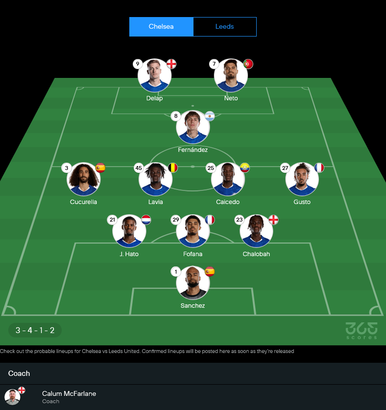 เชลซีของ คาลั่ม แม็กฟาร์เลน เจอปัญหาหนักเรื่องขุมกำลัง เพราะ โคล พัลเมอร์, เอสเตเวา, ฟิลิป ยอร์เกนเซ่น, เจมี่ กิตเท่นส์, เชา เปโดร, ลีไว โคลวิลล์ และ รีซ เจมส์ ยังเจ็บ ส่วน มีคายโล มูดริค ติดโทษแบน คาดว่าจะใช้ระบบ 3-4-1-2 โดยให้ เอ็นโซ่ เฟร์นานเดซ เป็นตัวเชื่อมเกมหลังคู่หน้า เลียม ดีแล็ป กับ เปโดร เนโต้ ซึ่งในมุม วิเคราะห์บอล เชลซีต้องเล่นให้คมกว่าช่วงหลังเยอะ ไม่งั้นโดนลีดส์บีบจนหายใจไม่ออกแน่