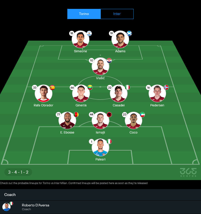 โตริโน่ของ โรแบร์โต้ ดาแวร์ซ่า คาดว่าจะมาในระบบ 3-4-1-2 เน้นหลังสามให้แน่น แดนกลางใช้ กิเนติส กับ คาซาเดอี คุมจังหวะ โดยมี วลาซิช ยืนหลังคู่หน้า ซิเมโอเน่ กับ เช อดัมส์ เกมนี้ในการ วิเคราะห์บอล จุดสำคัญคือโตริโน่ต้องเสียบอลยาก และห้ามเปิดพื้นที่ให้วิงแบ็กอินเตอร์เติมสบาย