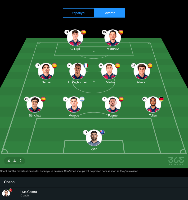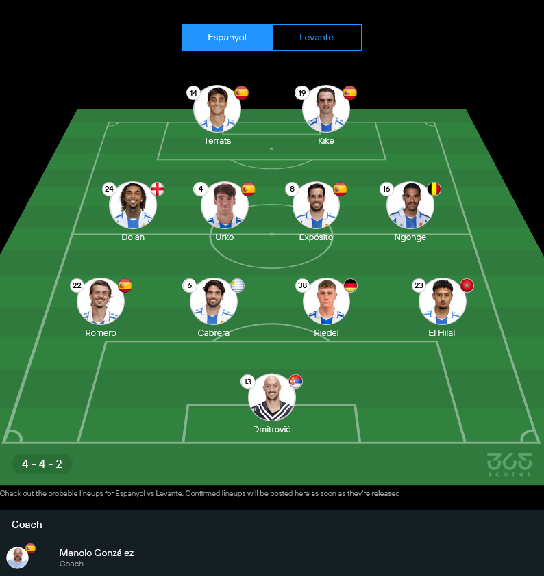 เอสปันญ่อลของ มาโนโล กอนซาเลซ ยังไม่มี ยาวี ปูอาโด้ ที่เจ็บยาว ส่วน เฟร์นานโด กาเลโร่ ต้องรอเช็กฟิต แต่ข่าวดีคือ อูร์โก กอนซาเลซ พ้นโทษกลับมา ทำให้แดนกลางมีตัวคุมจังหวะมากขึ้น คาดว่าจะมาในระบบ 4-4-2 ใช้ กีเก้ การ์เซีย เป็นตัวจบสกอร์หลัก คู่กับ เทอร์รัตส์ โดยทีมต้องระวังเสียบอลง่าย เพราะเลบันเต้กำลังสวนกลับมั่นใจมาก