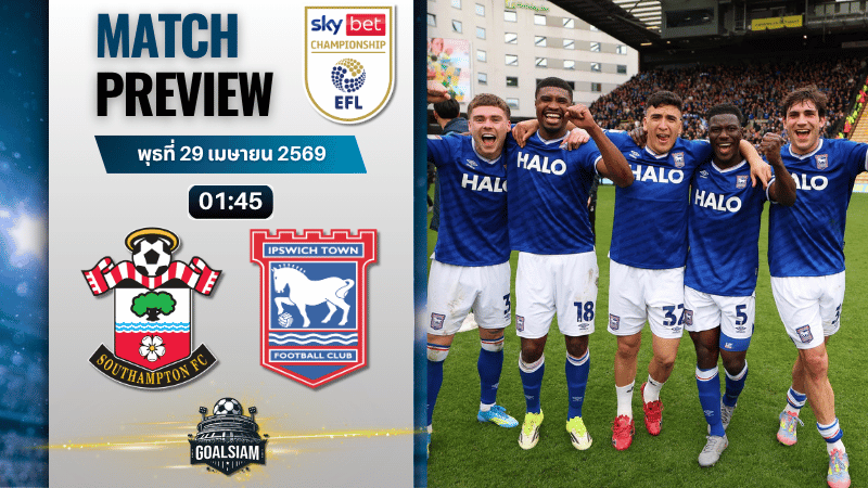 ศึกแชมเปี้ยนชิพ อังกฤษ คืนวันพุธที่ 29 เมษายน 2569 เวลา 01.45 น. เป็นเกมโซนบนที่เดือดแน่ เซาธ์แฮมป์ตัน ทีมอันดับ 5 เปิดบ้านรับ อิปสวิช ทาวน์ ทีมอันดับ 2 แต้มทุกแต้มมีผลต่อพื้นที่เลื่อนชั้นและเพลย์ออฟ ฝั่งนักบุญแข็งในบ้าน ส่วนม้าขาวก็เหนียวเวลาออกนอกถิ่น งานนี้ทีมงาน GOALSIAM มองว่าเป็นคู่ที่แฟนบอลสาย ทีเด็ดบอล ต้องจับตาให้ดี