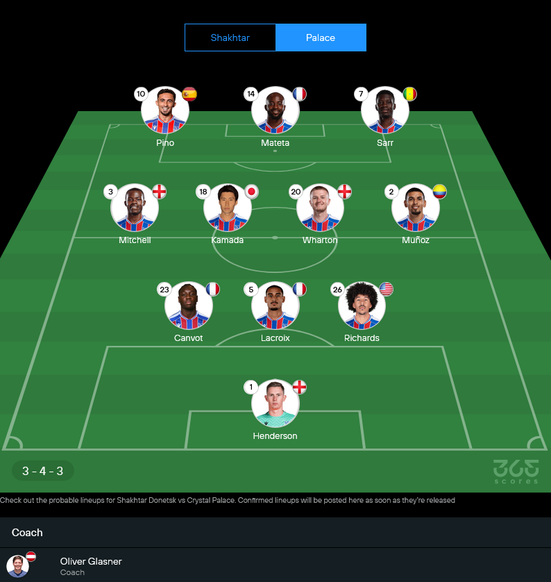 พาเลซของ โอลิเวอร์ กลาสเนอร์ คาดว่าจะยืน 3-4-3 ใช้ ดีน เฮนเดอร์สัน เป็นด่านสุดท้าย แนวรับสามคนมี คริส ริชาร์ดส์, มักซ็องซ์ ลาครัวซ์ และ เจย์ดี ก็องโวต์ วิงแบ็กขวาเป็น ดาเนี่ยล มูนญอซ ฝั่งซ้ายใช้ ไทริค มิตเชลล์ ส่วนแดนกลางให้ ไดจิ คามาดะ กับ อดัม วอร์ตัน คุมเกม แนวรุกมี เยเรมี่ ปิโน่, ฌอง-ฟิลิปป์ มาเตต้า และ อิสไมล่า ซาร์