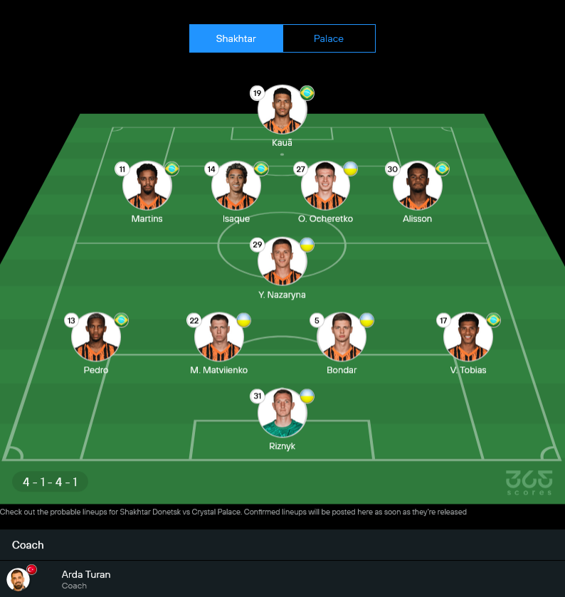 ชัคห์ตาร์ของ อาร์ดา ตูราน มาในระบบ 4-1-4-1 โดยมี ดมิโทร ริซนิค เฝ้าเสา แนวรับใช้ วินิซิอุส โทเบียส, วาเลรี่ บอนดาร์, มิโคล่า มัตวิเยนโก้ และ เปโดร เฮนริเก้ แดนกลางมี เยกอร์ นาซารีนา ยืนคุมจังหวะหน้าแผงหลัง ส่วนแนวรุกอัดตัวคล่อง ๆ อย่าง มาร์ตินส์, อิซาเก้, โอเชเร็ตโก้, อลิสซง คอยป้อนให้ คาวาอา หน้าเป้า