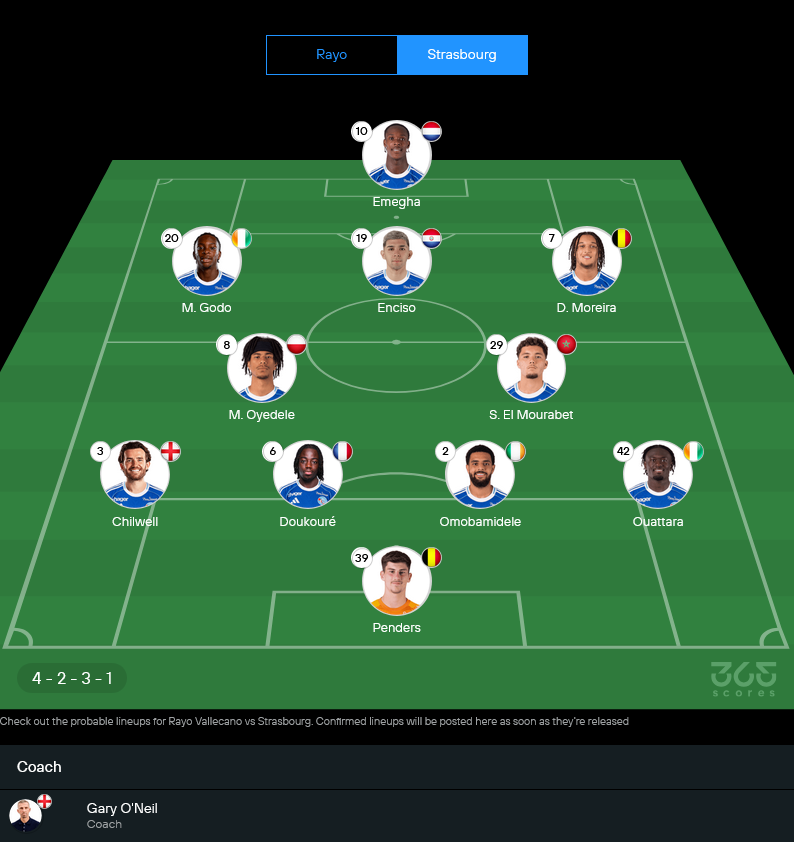 สตราส์บูร์กของ แกรี่ โอนีล มีรายชื่อเจ็บหลายคน ทั้ง อารอน อันเซลมิโน่, ฆัวคิน พานิเชลลี่, มาติส อามูกู, วาเลนติน บาร์โก้ และต้องเช็กความพร้อม เกล่า ดูเอ้ ที่มีอาการป่วย นี่คือปัญหาไม่น้อย เพราะตัวเลือกหมุนเวียนลดลงชัดเจน แต่ชุดหลักยังถือว่าน่าดู โดยเฉพาะแนวรุกที่มี ดีเอโก้ โมเรร่า, ฮูลิโอ เอ็นซิโซ่, มาร์กซิยาล โกโด และ เอเมก้า เป็นแกนหลัก