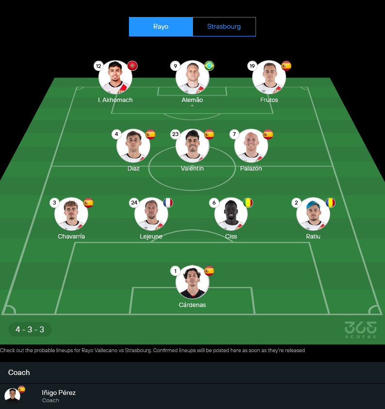 ราโย่ของ อีญิโก้ เปเรซ มีปัญหาผู้เล่นบาดเจ็บสำคัญคือ อัลบาโร่ การ์เซีย เจ็บกล้ามเนื้อ และ ลุยซ์ เฟลิเป้ เจ็บแฮมสตริง ทำให้การจัดทัพต้องเน้นนักเตะที่ฟิตและเข้าระบบมากที่สุด เกมนี้คาดว่าจะมาในแผน 4-3-3 ใช้แดนกลางสามคนคุมจังหวะ ส่วนแนวรุกวาง อิซี่ ปาลาซอน, อเลเมา และ ฆอร์เก้ เด ฟรูตอส เป็นสามประสาน ไล่กดดันแนวรับทีมเยือน