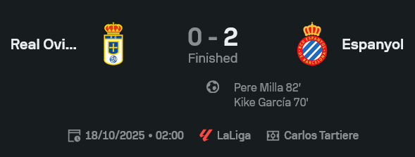 ศึก ลาลีกา สเปน คืนนี้แฟนบอลได้ซึ้งถึงคำว่า “บอลมันดราม่า” กันแบบจัดเต็ม เมื่อ เรอัล โอเบียโด พลาดท่าโดน เอสปันญ่อล บุกมาซัดสองเม็ดคารัง คาร์ลอสทาร์ติเอเร่ ทั้งที่เจ้าถิ่นครองบอลมากกว่าเห็นๆ แต่ความเฉียบคมเป็นของทีมเยือน สกอร์ 0-2 จบเกมแบบจุกๆ โดยเฉพาะจังหวะของ คีเก้ การ์เซีย ที่ซัดเปิดหัวในนาที 70 และปิดกล่องโดย เปเร่ มีย่า นาที 82 ดับความหวังแฟนโอเบียโดแบบช็อกทั้งสนาม แม้เกมนี้ ผลบอลสด จะออกมาแบบไม่เข้าข้างเจ้าบ้าน แต่ต้องยอมรับว่านี่คือบอลที่เอสปันญ่อล “คมและโหด” จริง