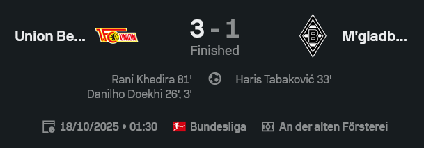 นี่คือเกมที่แสดงให้เห็นว่า ยูเนี่ยน เบอร์ลิน มีหมัดเด็ดแม้ครองบอลน้อยกว่าชัดเจน ทีมเยือนพยายามบุกคุมเกมแต่ไม่มีความเฉียบขาด ส่วนเจ้าถิ่นใช้จังหวะทองได้อย่างคม โดยเฉพาะ ดานิโล ดูคี ที่โผล่มายิงเบิ้ลตั้งแต่ครึ่งแรก ทำให้เกมง่ายขึ้นมาก ครึ่งหลังพอได้ประตูของเคห์ดิรา ก็แทบปิดแมตช์ทันที ฝั่ง กลัดบัค แม้ครองบอลเหนือกว่าแต่ขาดความเด็ดขาดในพื้นที่สุดท้าย นี่แหละคือจุดตายของเกมนี้ — จากมุมมอง GOALSIAM วิเคราะห์บอล ชัดเลยว่ายูเนี่ยนเบอร์ลินชนะด้วยประสิทธิภาพ ไม่ใช่แค่โชค