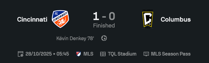 ศึก เมเจอร์ลีกซอกเกอร์ ที่ TQL Stadium แฟนบอลเจ้าถิ่นเฮลั่นสนามเมื่อ เอฟซี ซินซินเนติ เปิดบ้านเชือด โคลัมบัส ครูว์ 1-0 จากประตูชัยสุดเฉียบของ เควิน เดนกีย์ ในนาทีที่ 78 เกมนี้สูสีทั้งสองฝั่ง ครองบอล 50-50 เป๊ะ แถมดุเดือดตลอด 90 นาที แต่สุดท้ายเป็นฝั่งเจ้าบ้านที่คมกว่า คว้า 3 แต้มสำคัญไปครอง (ผลบอลสด: เอฟซี ซินซินเนติ 1-0 โคลัมบัส ครูว์)