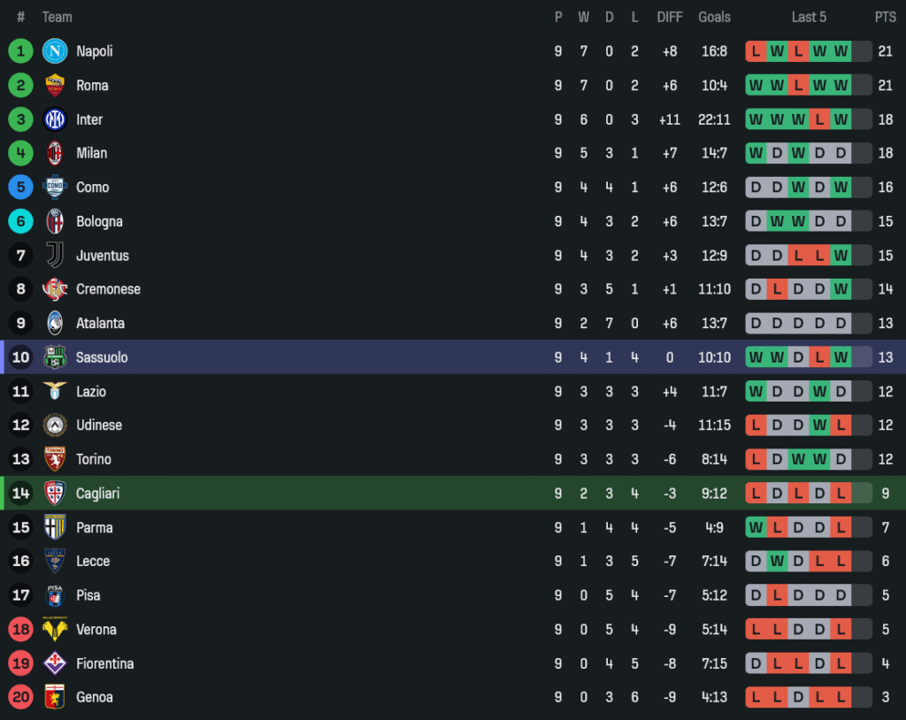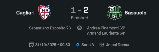การแข่งขันฟุตบอลกัลโช่ เซเรียอา เมื่อค่ำคืนที่ผ่านมา คู่ระหว่าง กาญารี่ เปิดบ้านรับการมาเยือนของ ซัสเซาโล่ จบลงด้วยชัยชนะของทีมเยือน ซัสเซาโล่ ที่บุกชนะ 1-2 โดยได้ประตูจาก อาร์มานด์ ลอเรนเต้ ในนาทีที่ 54 และ อันเดรีย พินามอนติ นาทีที่ 65 ส่วน กาญารี่ ได้ประตูปลอบใจจาก เซบาสเตียโน่ เอสโพซิโต้ นาทีที่ 73 ทำให้ซัสเซาโล่เก็บ 3 คะแนนสำคัญกลับบ้านไป