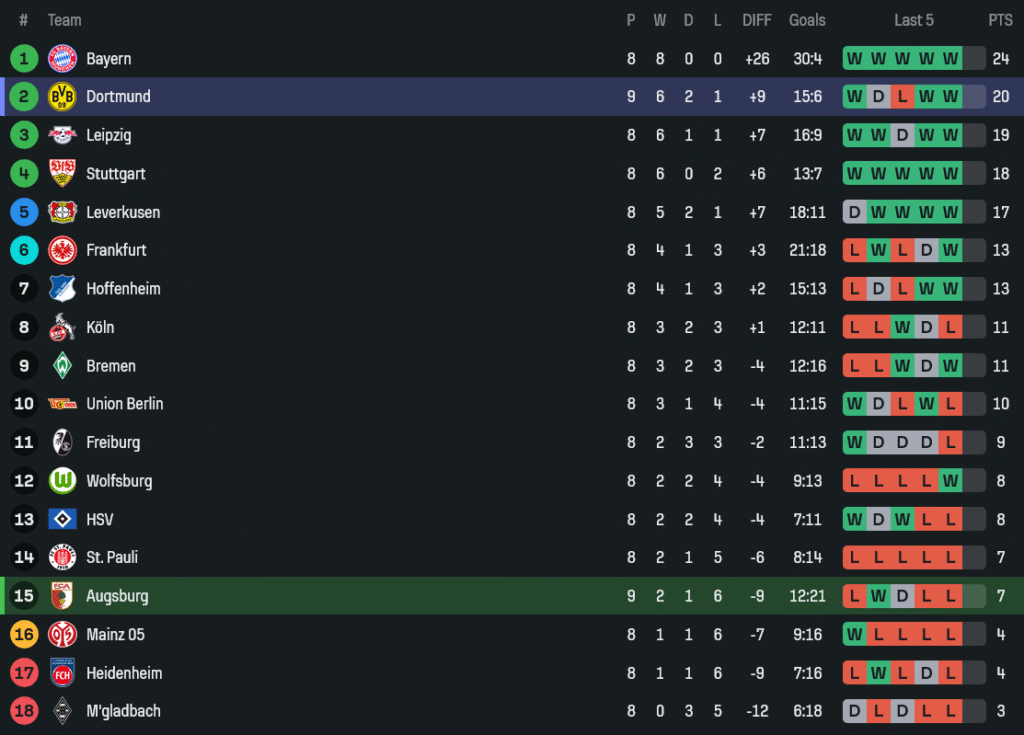 - ฟาวล์รวม: เอาก์สบวร์ก 14 – ดอร์ทมุนด์ 16