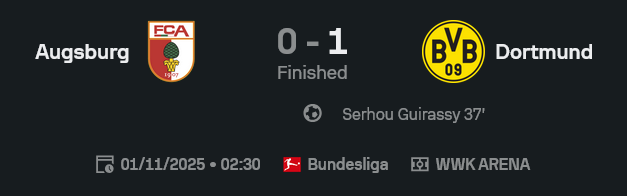 ศึก บุนเดสลีกา เยอรมัน ค่ำคืนสุดเข้มข้นที่ WWK Arena จบลงด้วย ผลบอลสด ที่ทำแฟนเสือเหลืองยิ้มออก เมื่อ โบรุสเซีย ดอร์ทมุนด์ บุกคว้าชัยเหนือ เอาก์สบวร์ก 1-0 จากประตูโทนของ เสร์อู กีราสซี่ ในนาที 37 เกมนี้แม้เจ้าถิ่นจะครองบอลมากกว่า แต่ทีมเยือนแสดงให้เห็นถึงความนิ่งและคมในจังหวะสำคัญแบบทีมลุ้นแชมป์ของจริง