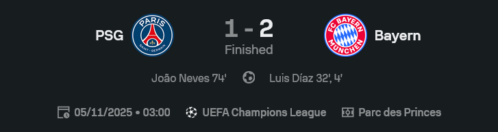 - ใบเหลือง: PSG 1 – บาเยิร์น 3 / ใบแดง: PSG 0 – บาเยิร์น 1
