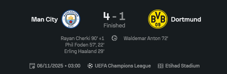 “เอทิฮัด สเตเดียม” คืนนี้เสียงดังลั่นเหมือนโรงงานผลิตความมั่นใจ เพราะลูกทีมของเป๊ป แมนเชสเตอร์ ซิตี้ เปิดบ้านจัดหนัก โบรุสเซีย ดอร์ทมุนด์ แบบไม่เหลือฟอร์มเยอรมัน ยิงกระหน่ำ 4-1 ในศึก ยูฟ่าแชมเปียนส์ลีก กลุ่มรอบแบ่งกลุ่ม ซึ่งดูจาก ผลบอลสด แล้ว งานนี้เรือใบขับเครื่องเทอร์โบจนเสือเหลืองโดนลากลงน้ำทั้งตัว