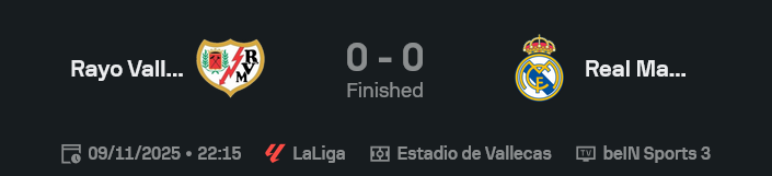 เกมนี้เรียกว่า “ราชันชุดขาว” เล่นเหมือนเครื่องดับกลางอากาศ ทั้งที่ขนแนวรุกชุดใหญ่ลงครบ แต่กลับทำอะไร ราโย่ บาเยกาโน่ ไม่ได้เลย จบด้วย ผลบอลสด 0-0 ที่แฟนบอลมาดริดถึงกับบ่นลั่นว่า “ยิงไม่ได้ก็อย่าเหนื่อยลงสนามเลย!” เพราะฝั่งเจ้าบ้านสู้ยิบตา วิ่งบี้ยันนาทีสุดท้าย สุดท้ายแบ่งแต้มไปแบบที่เจ้าถิ่นยิ้ม ส่วนฝั่งเยือนเดินคอตกกลับมาดริด
