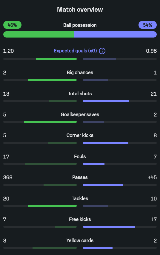 - xG (ค่าคาดหวังประตู): ราโย่ 1.20 / มาดริด 0.98 ใกล้เคียงแต่ไร้ประสิทธิภาพ