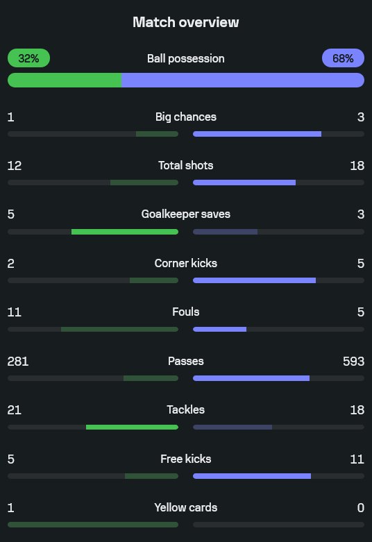 1. วีคอมบ์ครองบอล 68% ยิง 18 ครั้ง เข้าเป้า 8