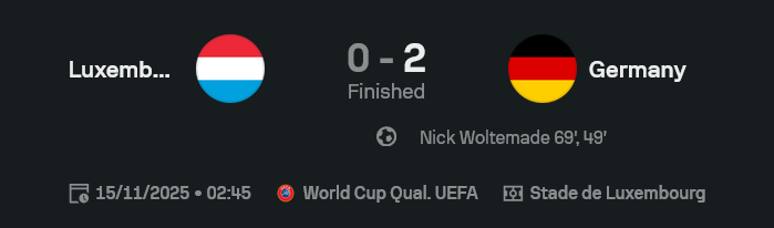 Wirtz คุมเกมแดนกลางเหมือนพ่อบ้านแจกงาน ส่วน Woltemade วันนี้คือพระเอกเต็มๆ ยิงสองลูกแบบมั่นใจสุดขีด เกมนี้เยอรมนีไม่ได้แรง แต่แม่นและนิ่ง เลยเก็บสามแต้มไปแบบหล่อๆ