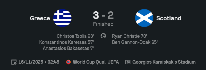 เกมนี้แม่งเดือดตั้งแต่นาทีแรก จนเสียงเชียร์ในสนาม Georgios Karaiskakis สั่นเป็นเจ้าเข้า เจ้าบ้านกรีซเปิดหัวไว บวกทีละเม็ดจนสกอตแลนด์ต้องงัดวิญญาณนักสู้ลุกขึ้นมาสู้ตามสูตร แต่สุดท้ายก็โดนเจ้าถิ่นตบเก็บสามแต้มไปแบบสุดมันส์ 3-2 ตาม ผลบอลสด ที่ลั่นไปทั้งโซเชียล บอกเลยคู่นี้โคตรคุ้มค่าเวลานั่งดูยันตีสาม!