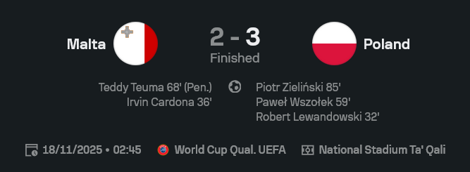 สุดท้ายเป็นโปแลนด์ที่เฉือนชนะ 3-2 จากลูกยิงคม ๆ ของเลวานดอฟสกี้และทีเด็ดอีกดอกจากซิเอลินสกี้ ส่วนมอลตานี่โคตรใจถึง ซัดคืนสองลูกแบบไม่กลัวหน้าไหนทั้งนั้น!