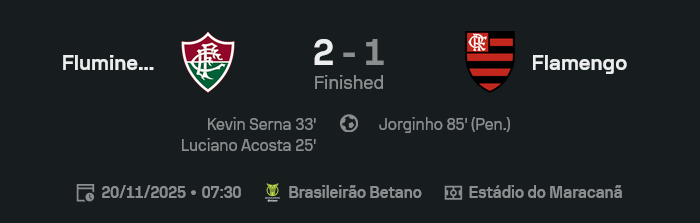 ศึกใหญ่กังเปโอนาตู บราซีเลย์รู แซรียีอา 2025/26 ที่มาราคาน่า เกมนี้ ฟลูมิเนนเซอาร์เจ เล่นงานเพื่อนบ้านตัวแสบอย่าง ฟลาเมงโก แบบแฟนเจ้าบ้านสะใจสุด ๆ แม้รูปเกมโดนบุกยับ แต่สกอร์บนหน้า ผลบอลสด จบที่ 2-1 ให้เจ้าถิ่น จากลูกยิงคมกริบของ ลูเซียโน่ อโคสต้า กับ เควิน เซร์น่า ก่อนโดนจอร์กินโญ่ซัดจุดโทษไล่มาท้ายเกม แต่ก็ไล่ไม่ทัน