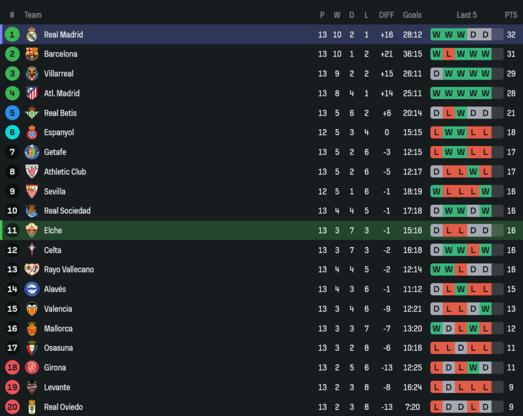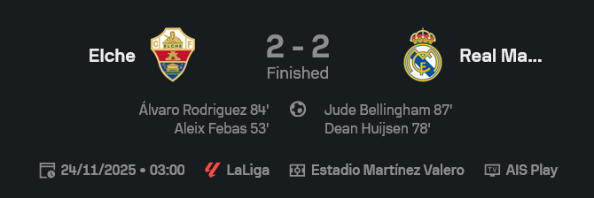 • ใบเหลือง: เอลเช่ 4 – มาดริด 1