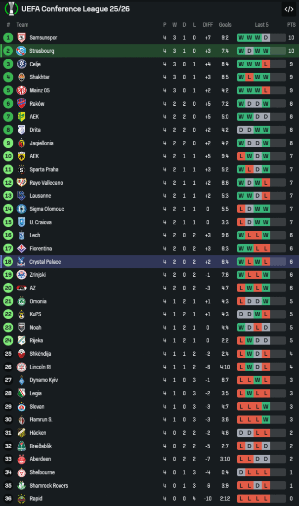 - ฟาวล์: สตารส์บูร์กทำ 5 ครั้ง ส่วนพาเลซฟาวล์ 13 ครั้ง เกมเดือดแต่เจ้าบ้านนิ่งกว่า