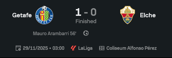 คืนนี้แฟนลาลีกานั่งลุ้นจอแทบค้างเมื่อ เกตาเฟ่ เปิดโคลิเซียม อัลฟอนโซ เปเรซ รับมือ เอลเช่ เกมอาจไม่ยิงกันถล่ม แต่ความแน่นของแท็กติกนี่ระดับเหนียวหนึบ ผลจบที่เจ้าบ้านเบียดชนะ 1-0 จากลูกยิงใส่สกอร์บอร์ดของ เมาโร อารัมบาร์รี นาที 56 ส่งให้แฟนเจ้าถิ่นเฮดังลั่น ส่วนคนดูเช็ก ผลบอลสด กันเพลินตอนตีสาม