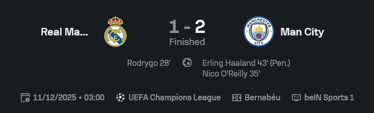 ศึก ยูฟ่าแชมเปียนส์ลีก 2025/26 ที่ซานติอาโก้ เบร์นาเบว เรอัล มาดริดเปิดบ้านเจอกับแมนเชสเตอร์ ซิตี้ เกมนี้ราชันชุดขาวออกสตาร์ตดี นำก่อนจากร็อดรีโก้ แต่โดนเรือใบสีฟ้ากลับมาอัดสองเม็ดรวดจาก นีโก้ โอ’ไรลลี่ กับจุดโทษของเออร์ลิง ฮาแลนด์ กลายเป็นสกอร์ที่แฟนๆ เช็กจากหน้า ผลบอลสด แล้วมีอุทานกันทั้งโซเชียลว่า “มาดริดหลุดโค้งอีกแล้วเหรอ!”