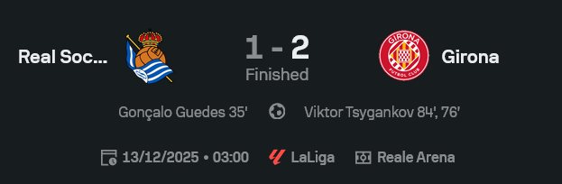 มองในมุม วิเคราะห์บอล เกมรับโซเซียดาดเหมือนคิดว่าลูกเดียวพอแล้ว เลยถอยบล็อกต่ำเกินไป เปิดช่องให้คิโรน่าเซ็ตบอลเข้าโซนหน้ากรอบง่าย ๆ พอเปลี่ยน จอห์น โซลิส กับ บี ยิล ลงมา เกมริมเส้นทีมเยือนมีชีวิตขึ้นทันที ทำให้ ทซีกานคอฟ ได้เล่นในพื้นที่ที่ถนัด ทั้งหุบมารับบอลระหว่างไลน์และฉีกไปครอส ผลคือสองประตูในช่วงไม่ถึง 10 นาทีเปลี่ยนเกมทั้งกระดาน