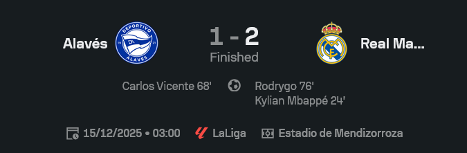 GOALSIAM ขอเล่าแบบคนเพิ่งเช็ก ผลบอลสด แล้วหัวใจเต้นแรง นัดนี้เรอัล มาดริดบุกไปเยือนเมนดิซอร์โรซซ่าแล้วเจองานช้าง อลาเบสวิ่งไล่บี้ทั้งเกม แต่สุดท้ายคลาสบอลและความนิ่งในพื้นที่สุดท้ายช่วยให้ชุดขาวบุกชนะ 2-1 เก็บสามแต้มตามบาร์ซ่าแบบไม่ปล่อยให้หนีไกล