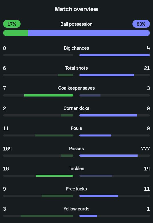 - ยิงทั้งหมด: เจ้าบ้าน 6 ครั้ง – ทีมเยือน 21 ครั้ง