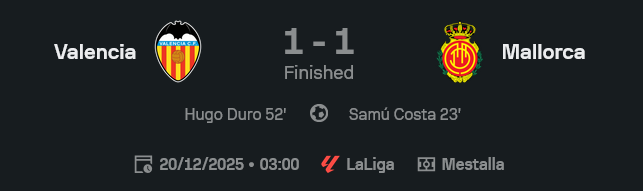 เกม ลาลิกา 2025/26 ที่เมสตาย่าคืนนี้ บาเลนเซียเปิดบ้านเจอคู่กัดโซนล่างอย่างมายอร์ก้า กลายเป็นอีกหนึ่งแมตช์ที่แฟนเช็ค ผลบอล แล้วต้องเกาหัว ว่าค้างคาวบุกโหมขนาดนี้ ทำไมได้แค่ 1-1 ทีมเยือนยิงนำก่อนจาก ซามู คอสต้า นาที 23 แล้วปล่อยให้เจ้าบ้านเดินเกมทุบกำแพงจน ฮูโก้ ดูโร่ ตีเสมอนาที 52 สุดท้ายแบ่งแต้มกันไปแบบทั้งเสียดายทั้งเซ็งสำหรับแฟนค้างคาว