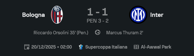 เกมนี้เปิดฉากมาไม่ทันหายใจ อินเตอร์กดก่อนตั้งแต่นาทีที่ 2 จากจังหวะหลุดไปยิงของมาร์คุส ตูราม เหมือนจะเดินเกมสบายๆ ตามหน้าเสื่อ แต่โบโลญญ่าดันไม่ยอมตาย ไล่บี้จนมาได้จุดโทษนาที 35 แล้วเป็นริคคาร์โด้ ออร์โซลินี่ ซัดไม่เหลือ สกอร์บนกระดาน ผลบอลสด ขึ้น 1-1 ตั้งแต่ครึ่งแรก ก่อนที่เกมจะตึงยาวไปถึงต่อเวลาและดวลจุดโทษ สุดท้ายอินเตอร์มือไม้สั่นพลาดกันเอง เปิดทางให้โบโลญญ่าล็อกชัย 3-2 เข้าชิงแบบโคตรเกรี้ยวกราด