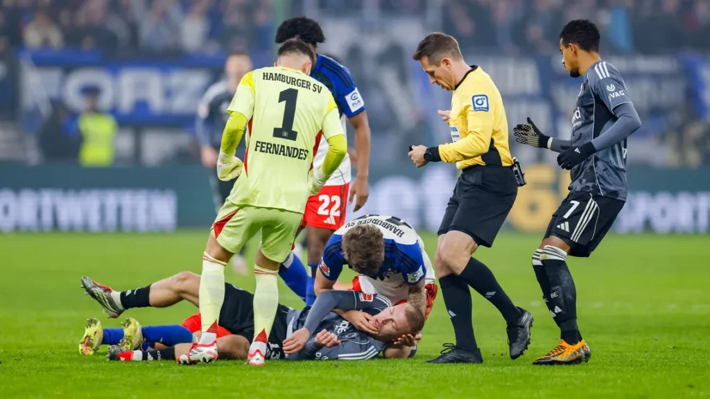 เกมระหว่าง ฮัมบูร์ก กับ ไอน์ทรัค แฟร้งค์เฟิร์ต เดินหน้าอย่างเข้มข้นตามสไตล์ฟุตบอลเยอรมัน จังหวะปัญหาเกิดขึ้นเมื่อ ราสมุส คริสเตนเซ่น เข้าปะทะแย่งบอลกับ มิโร มูไฮม์ ก่อนล้มลงกับพื้นและนอนนิ่งสร้างความตกใจให้ทั้งเพื่อนร่วมทีมและคู่แข่ง
