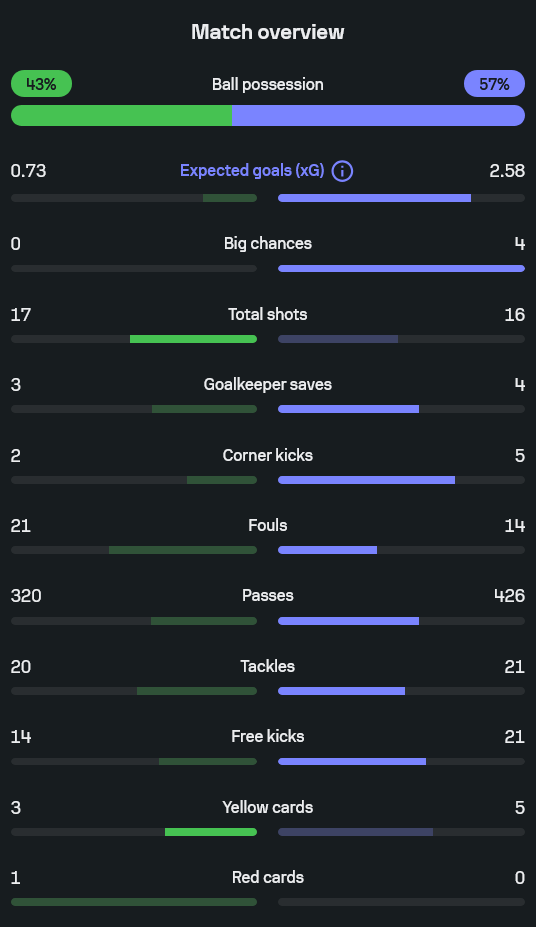 - ค่าคาดหวังประตู (xG): 0.73 – 2.58 ทีมเยือนคมและมีโอกาสเนื้อๆ เยอะกว่า