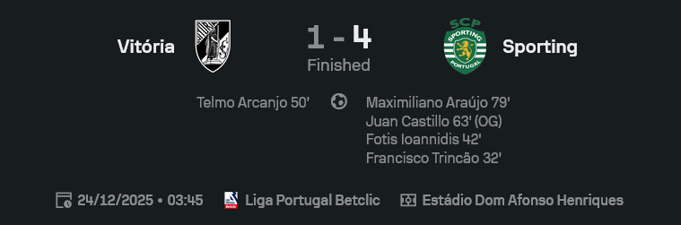 เกมนี้ในศึก ปรีไมราลีกา 2025/26 วิตอเรีย กิมาไรส์ เปิดรังรับ สปอร์ติ้ง ลิสบอน รูปเกมเปิดหน้าแลกกันมันส์หยด แต่คุณภาพฝั่งทีมเยือนคมกว่า เห็นได้ชัดจากรูปเกมและ ผลบอลสด ที่จบด้วยสกอร์ 1-4 แม้ เทลโม่ อรคันโญ จะโชว์ฟอร์มหล่อจนได้แมนออฟเดอะแมตช์ แต่เพื่อนร่วมทีมดันยุบหายตอนท้ายเกม แถมมีใบแดงปิดท้ายให้แฟนเจ้าบ้านเซ็งสองเด้ง