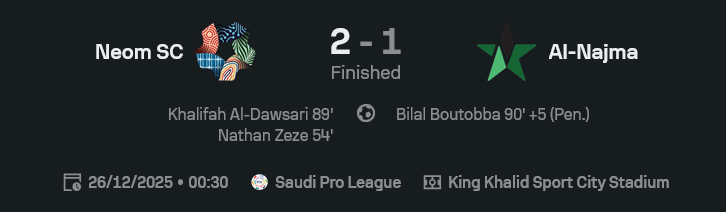 ใครเปิดดูช้า บอกเลยพลาดของดีระดับ ไฮไลท์บอลวันนี้ เพราะเกม ซาอุดิ โปรเฟสชั่นแนล ลีก 2025/26 คู่เนออมเปิดบ้านรับอัลนาจม่า มันส์แบบกดรีเฟรชเช็ก ผลบอลสด กันจนจอแทบไหม้ ครึ่งแรกนิ่งเหมือนจะจบ 0-0 แต่ครึ่งหลังของจริงเริ่ม เนออมขึ้นนำจาก นาธาน เซเซ่ นาที 54 ก่อน คาลิฟาห์ อัล-ดาวซารี่ จะซัดเม็ดสองนาที 89 ทำท่าปิดจ๊อบ แต่ดราม่ามาอีกดอกช่วงทดเวลาเมื่อ บิลาล บูโตบบ้า กดจุดโทษนาที 90+5 ไล่มา 2-1 ท้ายสุดเนออมรอดตาย คว้า 3 แต้ม ขยับขึ้นอันดับ 6 ของตาราง ขณะที่อัลนาจม่ายังจมบ๊วยต่อไปแบบเจ็บ ๆ คัน ๆ